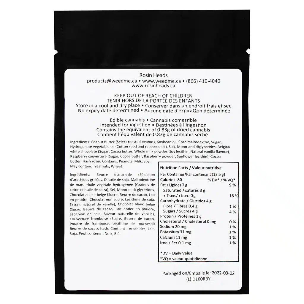 Ingrédients : Beurre de cacahuète (cacahuètes grillées sélectionnées, huile de soja, maltodextrine de maïs, sucre, huile végétale hydrogénée (huiles de coton et de colza), sel, mono- et diglycérides), chocolat blanc belge (sucre, beurre de cacao, lait entier en poudre, lécithine de soja, arôme naturel de vanille), couverture aux framboises (sucre, beurre de cacao, poudre de framboise, lécithine de tournesol), beurre de cacao, rosine de haschisch.