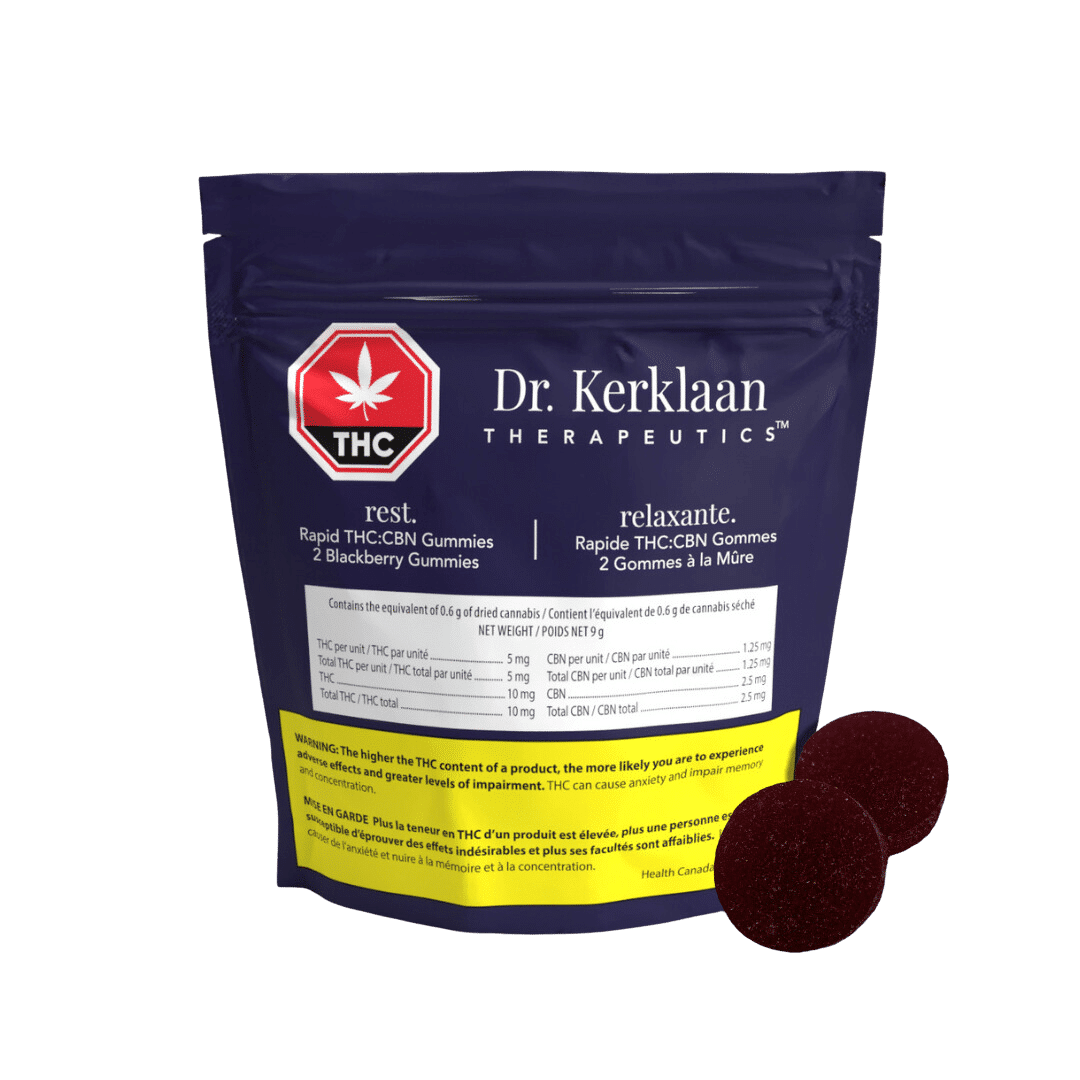 Kerklaan Therapeutics repose. Les gommes THC:CBN Rapid Gummies sont spécialement formulées pour être utilisées lorsque vous prenez le temps de vous détendre à la fin de votre journée. Idéales pour la nuit, nos gommes sont une solution de bien-être efficace, infusées d’un mélange 4:1 de 5 mg de THC et de 1,25 mg de CBN dans chaque gomme, avec un soupçon de mûre. Nos gommes sont enrichies d’O2W™, une technologie qui améliore naturellement l’absorption, basée sur 15 ans de recherche fondamentale à l’Université de Toronto. O2W™ est la technologie la plus avancée disponible pour que votre corps absorbe plus, à un rythme plus rapide, avec un début plus prévisible. Nous vous souhaitons de meilleures nuits. Reposez-vous bien.