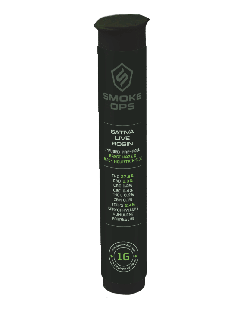 Le Sativa Live Rosin Infused Preroll de Smoke Ops offre une expérience de cannabis sans solvant de première qualité dans un format pratique de 1g. Ce preroll méticuleusement élaboré combine de la fleur séchée Bangi Haze avec du Live Rosin extrait de Black Mountain Side, le tout terminé par un enrobage de kief riche en trichomes. Conçu pour ceux qui recherchent une expérience stimulante et énergique, ce produit au format sativa illustre la qualité et la puissance que l’on peut obtenir grâce à des méthodes d’extraction sans solvant. Avec une teneur élevée en THC de 27,8 % et un profil terpénique robuste, ce preroll infusé offre une session structurée et aromatique du début à la fin.