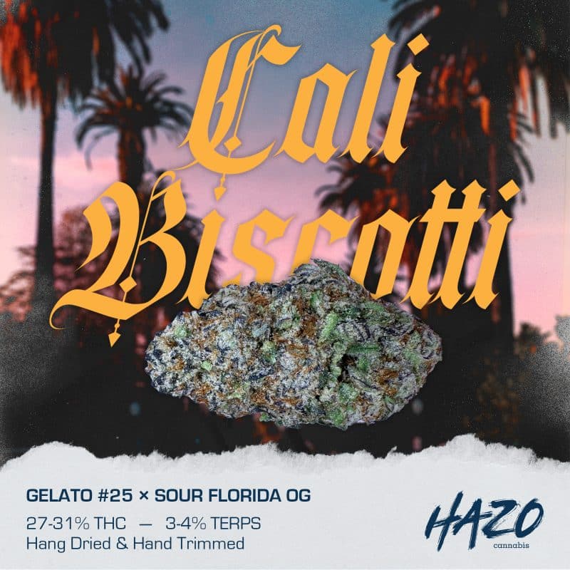 HAZO Cali Biscotti 14g flower is an indica-dominant hybrid strain, boasting an impressive genetic lineage that includes Gelato #25, Girl Scout Cookies, and South Florida OG. Its remarkable blend of effects and flavours is certain to enchant both seasoned connoisseurs and those new to the world of cannabis. Featuring high THC levels along with some really dank tangy terpenes, HAZO Cali Biscotti delivers a memorable experience. The journey begins with a rush of cerebral effects that elevate your mind to a state of blissful distraction. As your mental faculties settle, a soothing body high takes over, allowing you to unwind and let go of all worries. This high gradually evolves into a cheerful and giggly state, leaving you amused by the world around you. One of the standout features of HAZO Cali Biscotti is its mouthwatering flavour profile. With every toke, you’ll savour the delightful taste of tangy sugary citrus notes, accompanied by a rich and flavourful exhale. The aroma mirrors this decadence, offering a blend of tangy sourness, underscored by a prominent orangey cookie scent.