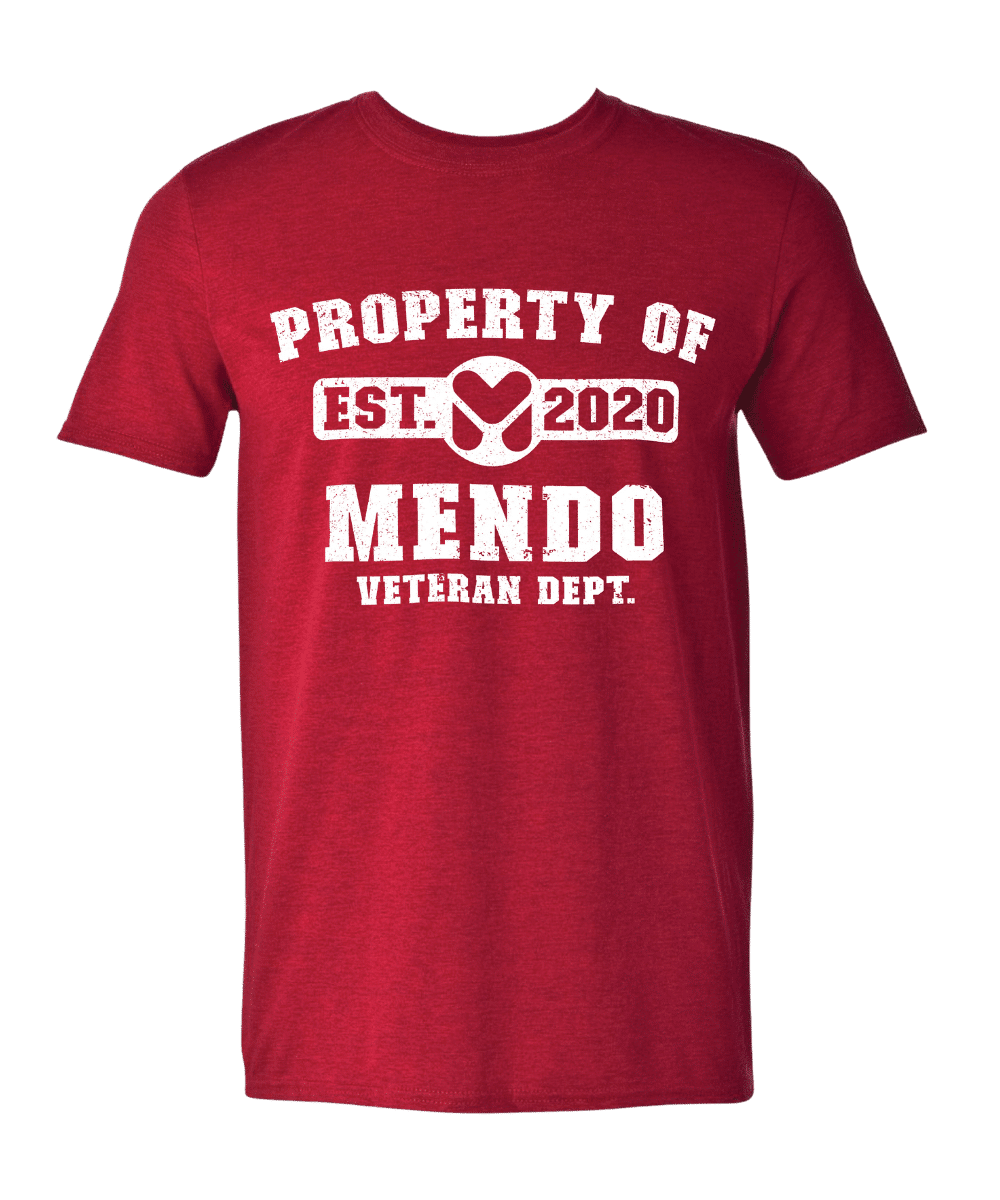 - Bold “Property of Mendo – Veteran Department” graphic in Antique Cherry Red